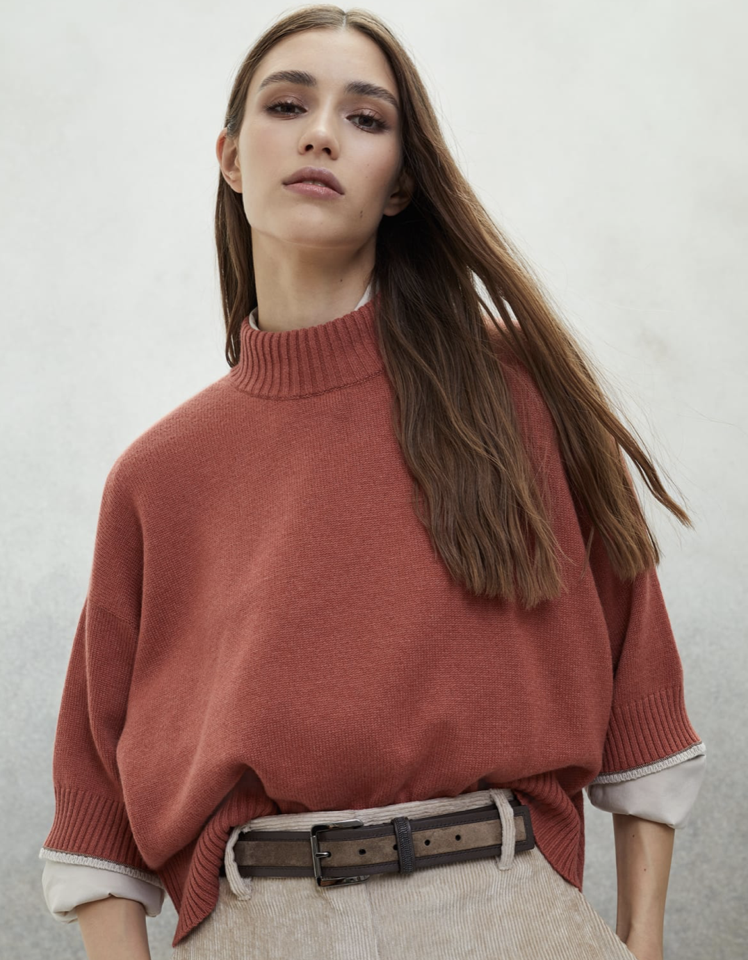 Quiet Luxury is all that, but it whispers. Colors are soft and often neutral—camel, gray, beige, ecru. If there's color it's muted. Fabrics are soft too—jersey, cashmere, fine wool, silk—and the shapes less structured. One brand, Bruno Cuchinelli, has been doing this for a while. It's quiet luxury and not in any sense sense affordable. This cashmere sweater is $3,000.